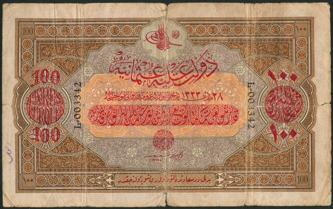 (x) Ottoman Empire, 100 livres, 1333 AH (1917), serial number L 003342, red, grey and orange, toughra of Muhammad V top centre, value at left and right, Cavid and Cahid signatures, reverse pale brown and mauve, value low left and right