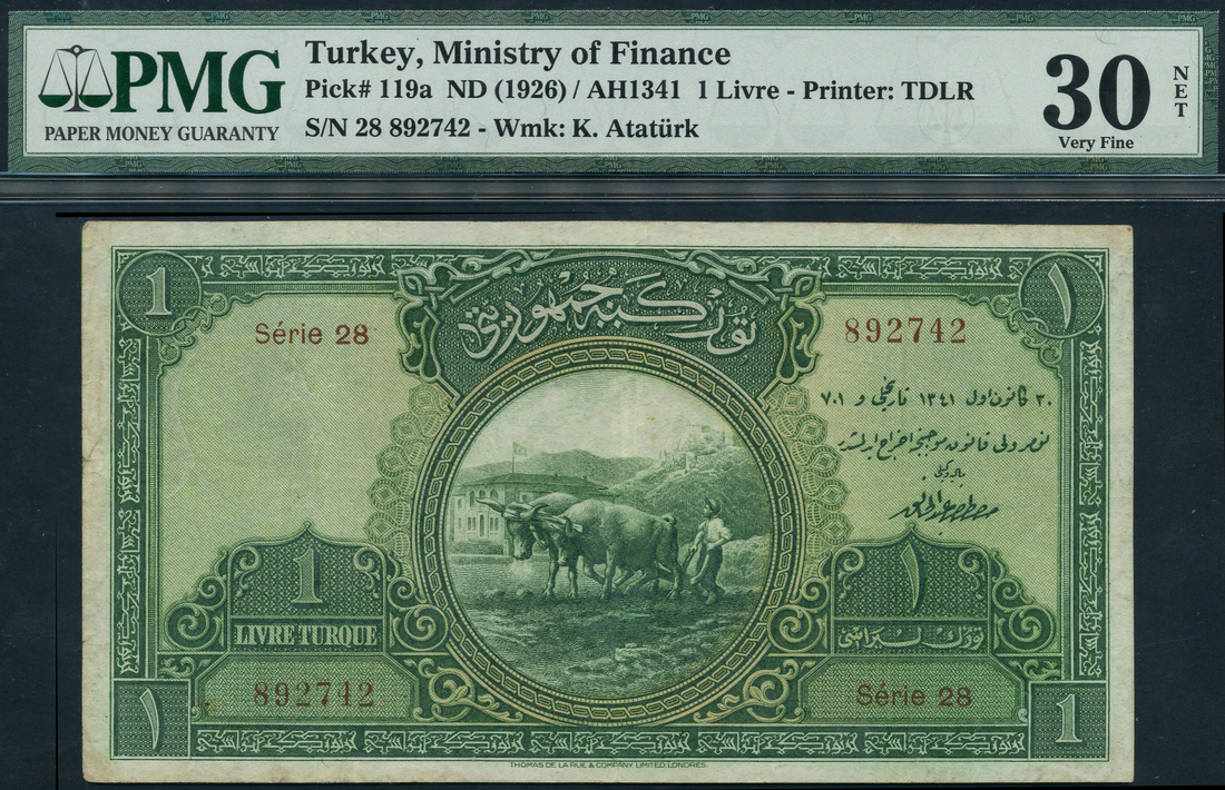 (x) Ministry of Finance, Turkey, 1 livre, AH 1341 (1926), maroon serial number 28-892742, green, ploughteam at centre, Renda signature, reverse green, the Prime Ministry building