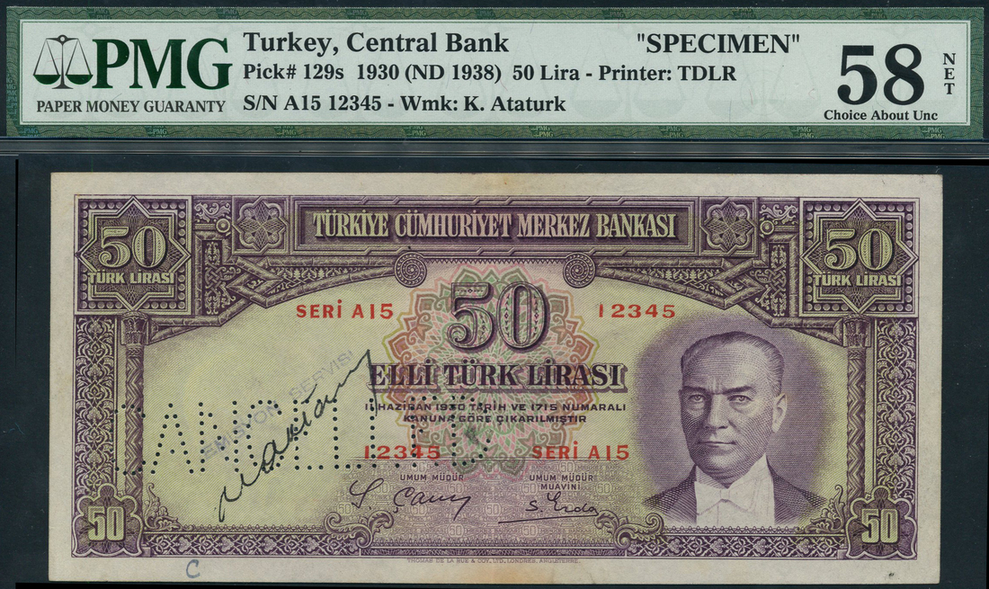 (x) Central Bank of Turkey, specimen 50 lirasi, law of 1930 (1938), red serial number A15 12345, purple and multicoloured, Ataturk at right, Cam and Erda signatures, reverse purple, Angora goats