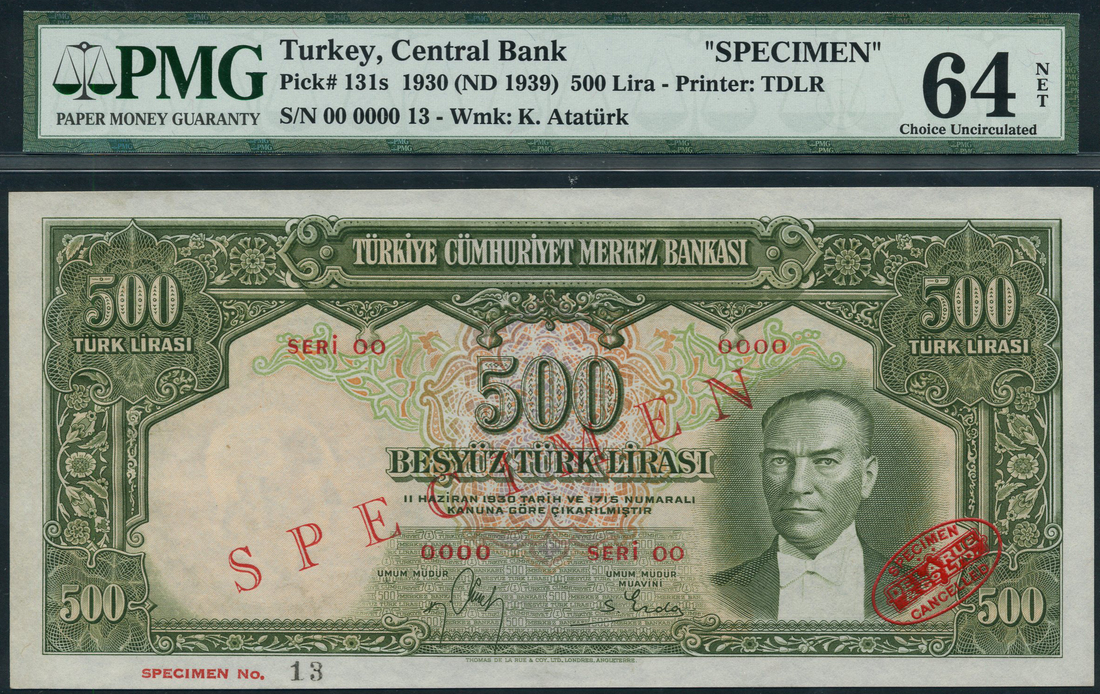 (x) Central Bank of Turkey, specimen 500 lirasi, law of 1930 (1939), red serial number 00-0000, green and multicoloured, Ataturk at right, Sunel and Erda signatures, reverse green, Roumeli Hissar castle at centre, value at left and right