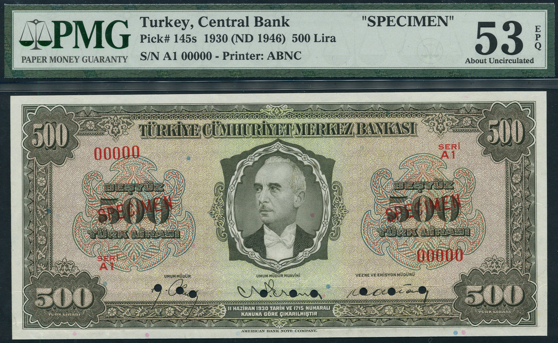(x) Central Bank of Turkey, specimen 500 lirasi, law of 1930 (1946), red serial number A1 00000, olive green and multicoloured, President Inonu at centre, Sunel and Ersun signatures, reverse olive, students at the technical school in Ankara, value at each corner