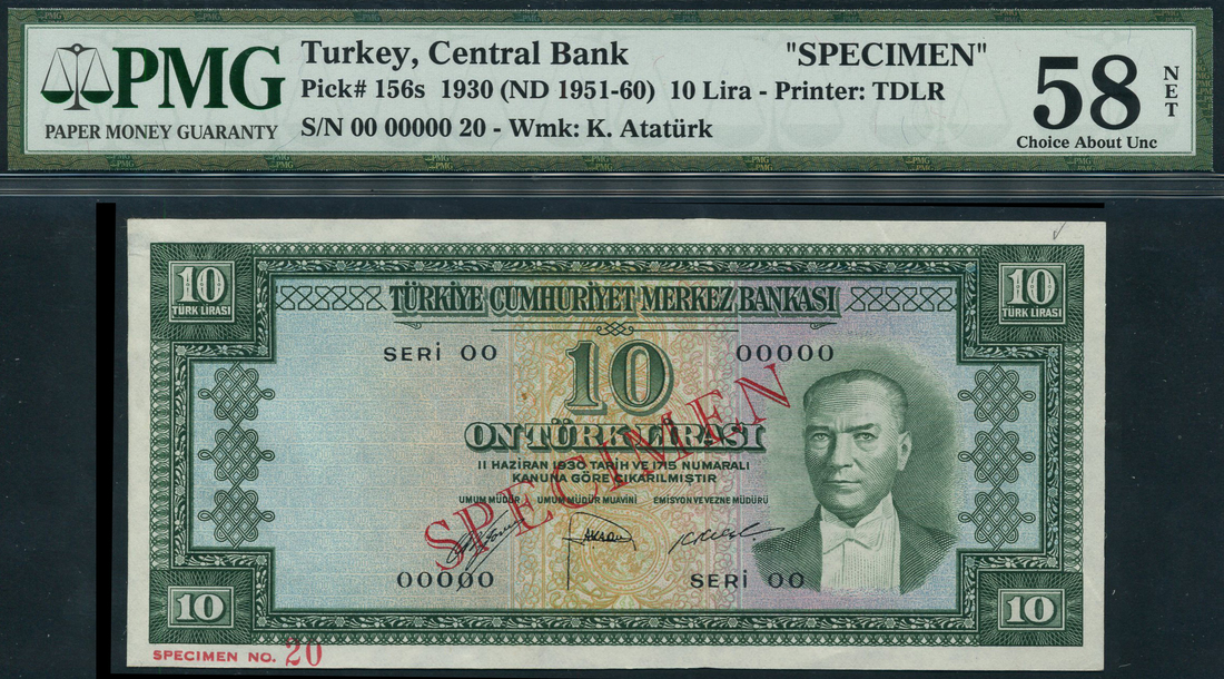 (x) Central Bank of Turkey, specimen 10 lirasi, law of 1930 (1951-1960),black serial number 00-00000, green and multicoloured, Ataturk at right, Gover, Aksan and Kibrish signatures, reverse green, stone bridge in Edirne at centre