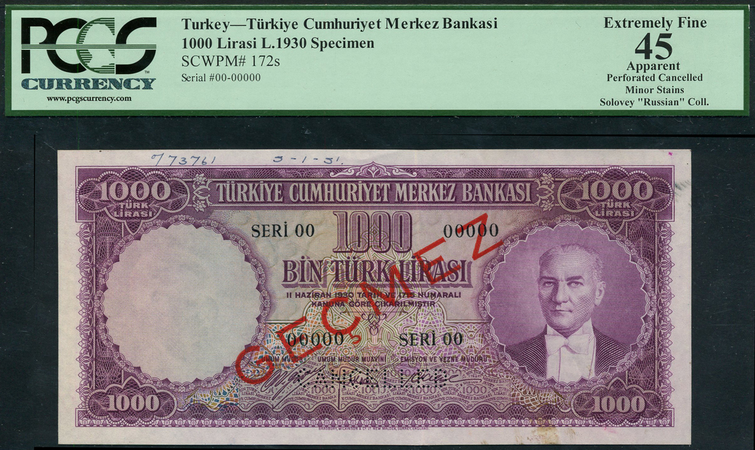 (x) Central Bank of Turkey, specimen 1000 lirasi, law of 1930 (1953),black serial number 00-00000, purple and multicoloured, Ataturk at right, Gover, Aksan and Kibrish signatures, reverse purple, Roumeli Hissar Castle
