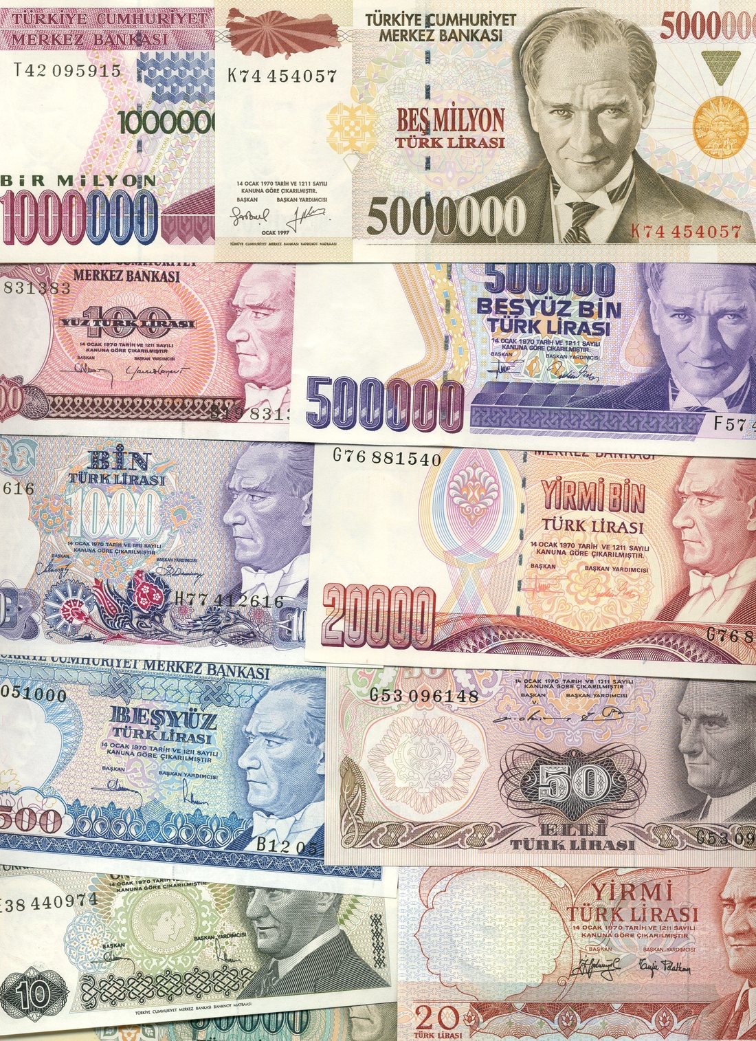 (x) Turkey, a miscellaneous group comprising 5 and 20 piastres, AH 1332, 1/2 livre, AH 1331, pink, 1 livre, AH 1331, violet, payment orders (5), 5,10,50 (2) and 100 piastres, all King Farouk top centre, also a selection of more modern issues with Ataturk portrait (23),