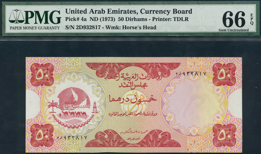 United Arab Emirates Currency Board, 50 dirhams, ND (1973), serial number 2D 932817, red on multicolour, value in ornate tablets in each corner, palm tree, caravan with man leading four camels, sama’a dhow with sail, oil derrick within circular frame at left, reverse, Sheikh’s palace at Ajman
