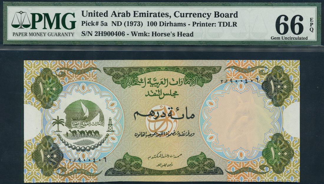United Arab Emirates Currency Board, 100 dirhams, ND (1973), serial number 2H 900406, dark green on multicolour, value in ornate tablets in each corner, palm tree, caravan with man leading four camels, sama’a dhow with sail, oil derrick within circular frame at left, reverse, Sheikh’s palace at Ajman