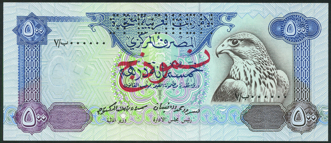 (x) United Arab Emirates Central Bank, a specimen set from the 1982 issue comprising 5 dirhams, pink, 10 dirhams, green, 50 dirhams, lilac, 100 dirhams, red and 500 dirhams, blue, red SPECIMEN overprint, perforated