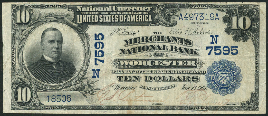 USA a group of notes comprising, Massachusetts State, 1 shilling, 1782, Citizens Bank, $10, 1862, Worcester Bank, $2, (unissued, on card), 181-, Merchants Bank, $3, 1864, Merchants National Bank of Worcester, $10, 1905, $5 and $10, 1929 series