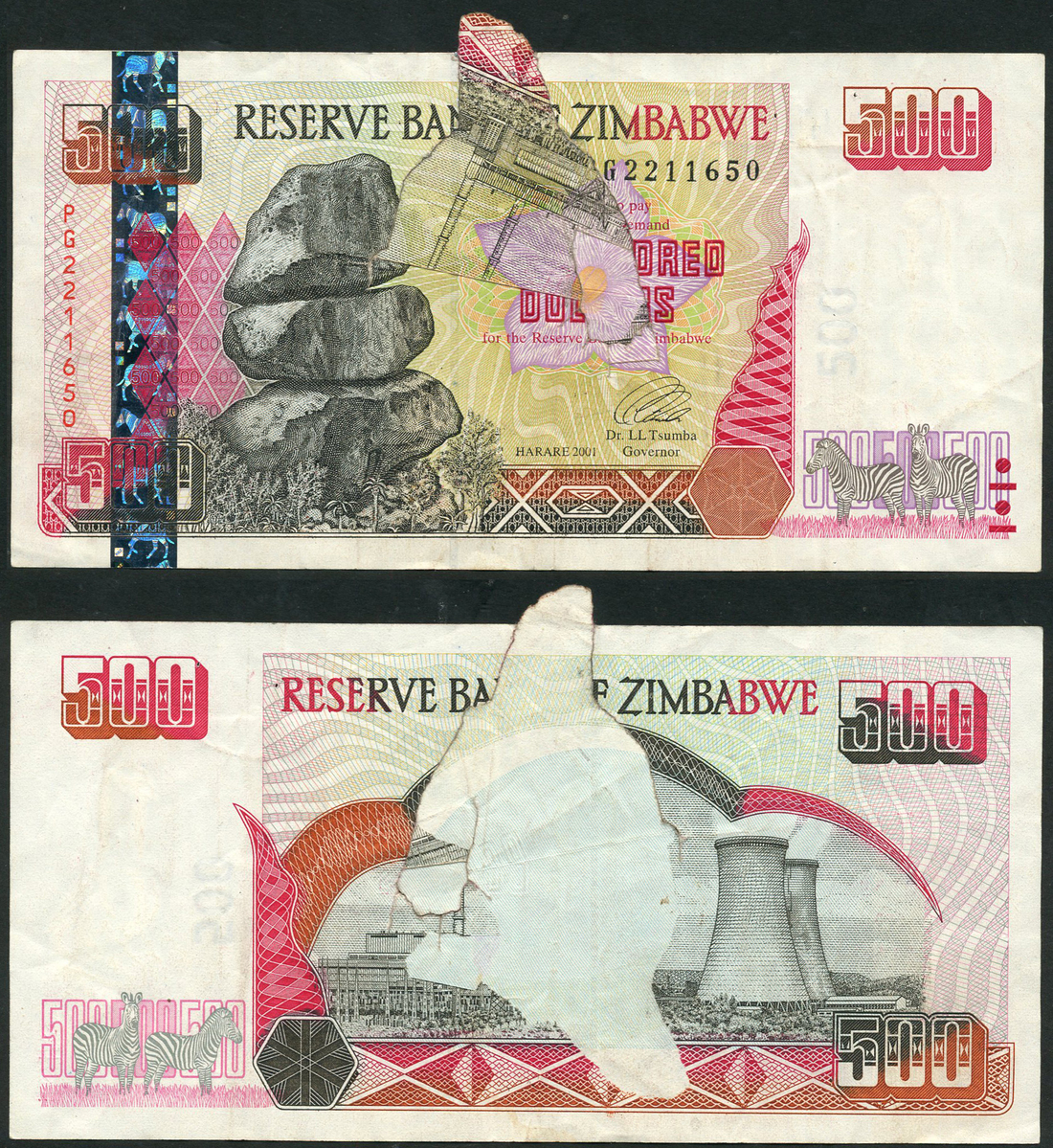 Reserve Bank of Zimbabwe, ERROR: $500, 2001, serial number PG2211650, green, red on multicolour underprint, Chiremba balancing rock at centre left, zebras low right, reverse, Hwange power station, misprint due to irregular shaped flap of paper centre printed over causing blank underneath