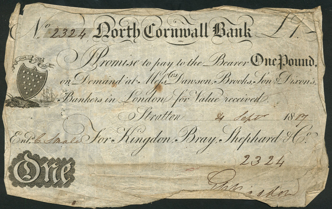 (x) North Cornwall Bank, Kingdon Bray Shephard & Co, £1, 4 September 1807, serial number 2324, black and white, bank title top centre, shield at left, value in black tablet low left