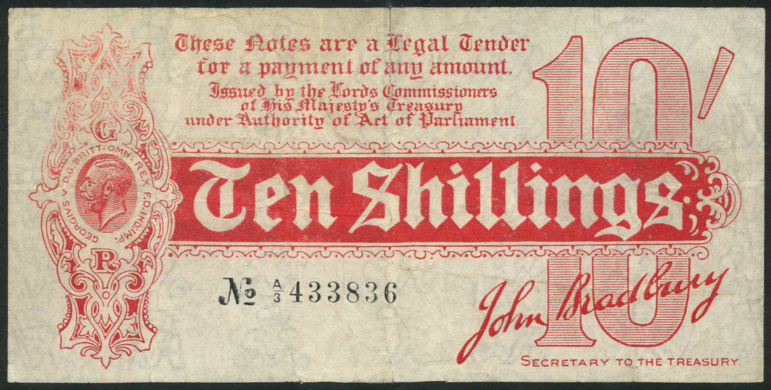 Treasury Series, John Bradbury, 10 shillings, ND (1914), serial number A/3 433836, uniface, red and white, portrait King George V at left, value in red tablet at centre