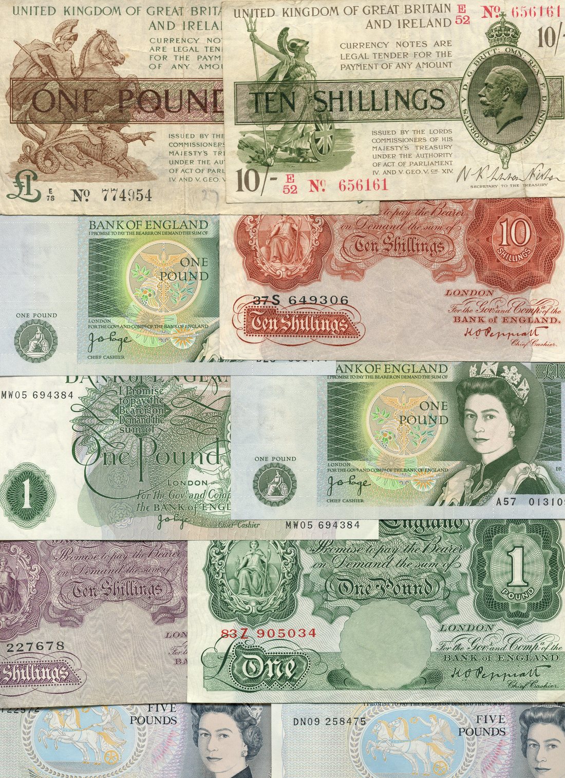 Treasury Series, John Bradbury, £1, ND (1917), prefix E/78, also N.F.Warren-Fisher 10 shillings, ND (1919), K.O.Peppiatt 10/-, brown and mauve respectively and £1, prefix 83Z (last of series), Peppiatt £1, blue, O'Brien 10/- (2), Fforde 10/-, Hollom 10/-, O'Brien £1 (5), Fforde £1, Hollom £1, Page £1 (6), Somerset £1 (3), Somerset £5 (4), also miscellaneous world notes (7)