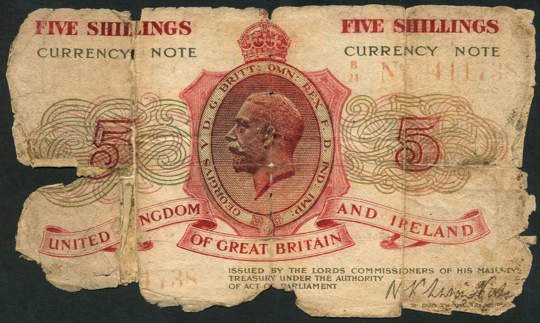 Treasury Series, N F Warren Fisher, 5 shillings, 28 November 1917, serial number B/21 411738, red and green, George V at centre, crown above, value at left and right