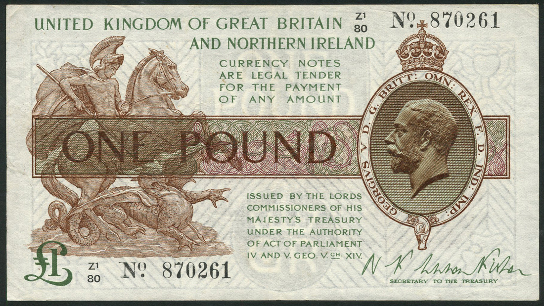 Treasury Series, N F Warren Fisher, Northern Ireland issue, 10 shillings, ND (1927), prefix T/6, green, lilac and white, crowned head of George V at right, Britannia at left, also £1 (3), ND (1927), prefixes T1/48, U1/74, Z1/80, crowned head of George V at right, Saint George and the dragon at left