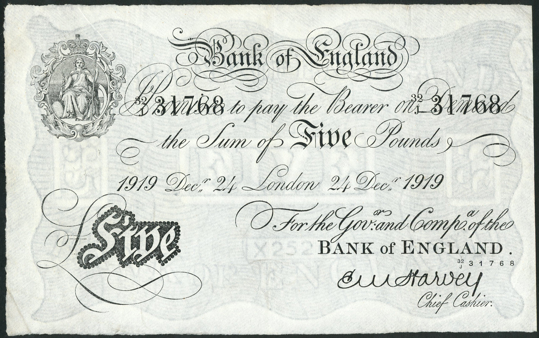 Bank of England, E M Harvey, £5, London, 24 December 1919, serial number 32/J 31768, black and white, ornate crowned vignette of Britannia top left, value in black tablet low left
