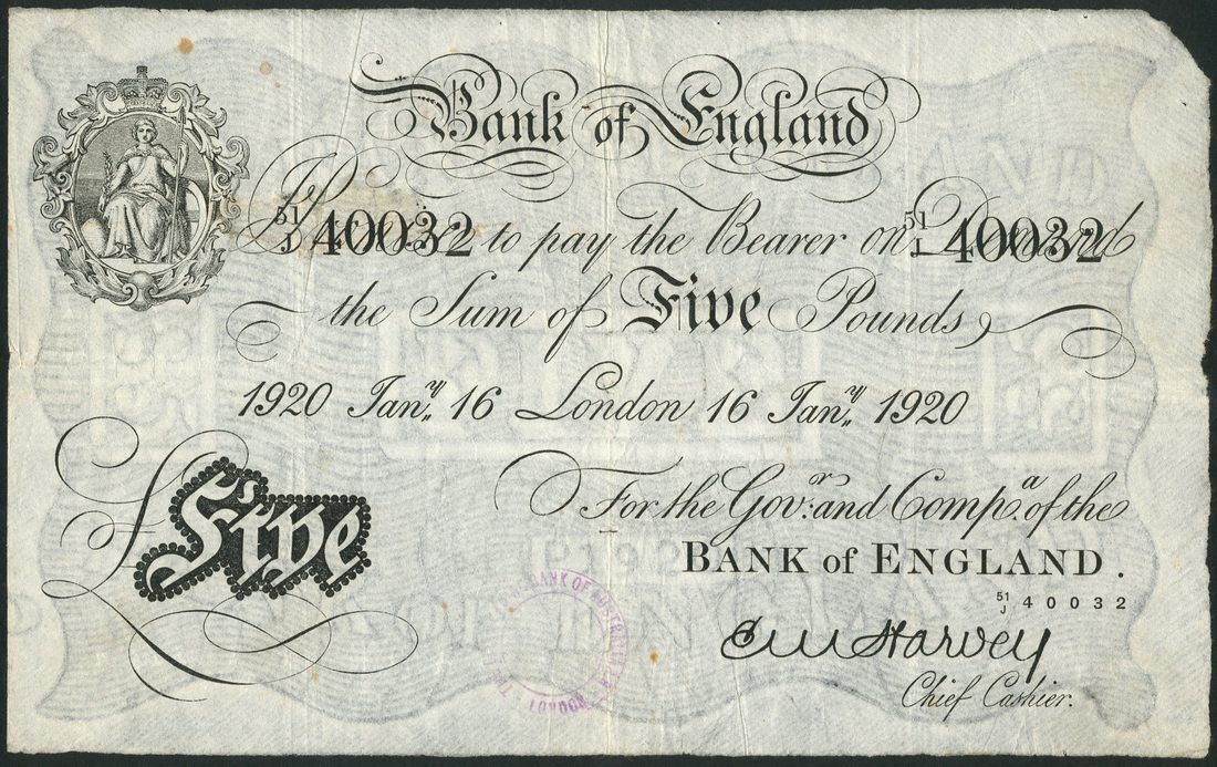 Bank of England, E M Harvey, £5, London, 16 January 1920, serial number 51/J 40032, black and white, ornate crowned vignette of Britannia top left, value in black tablet low left