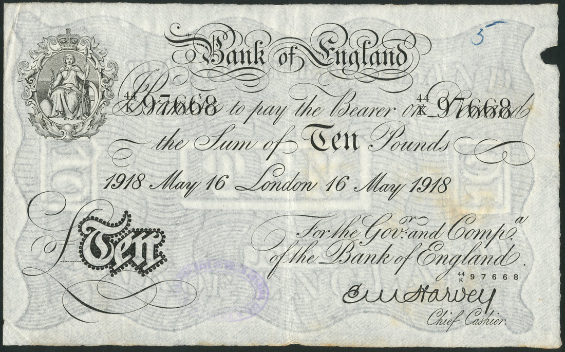 Bank of England, E M Harvey, £10, London, 16 May 1919, serial number 44/K 97668, black and white, ornate crowned vignette of Britannia top left, value in black tablet low left