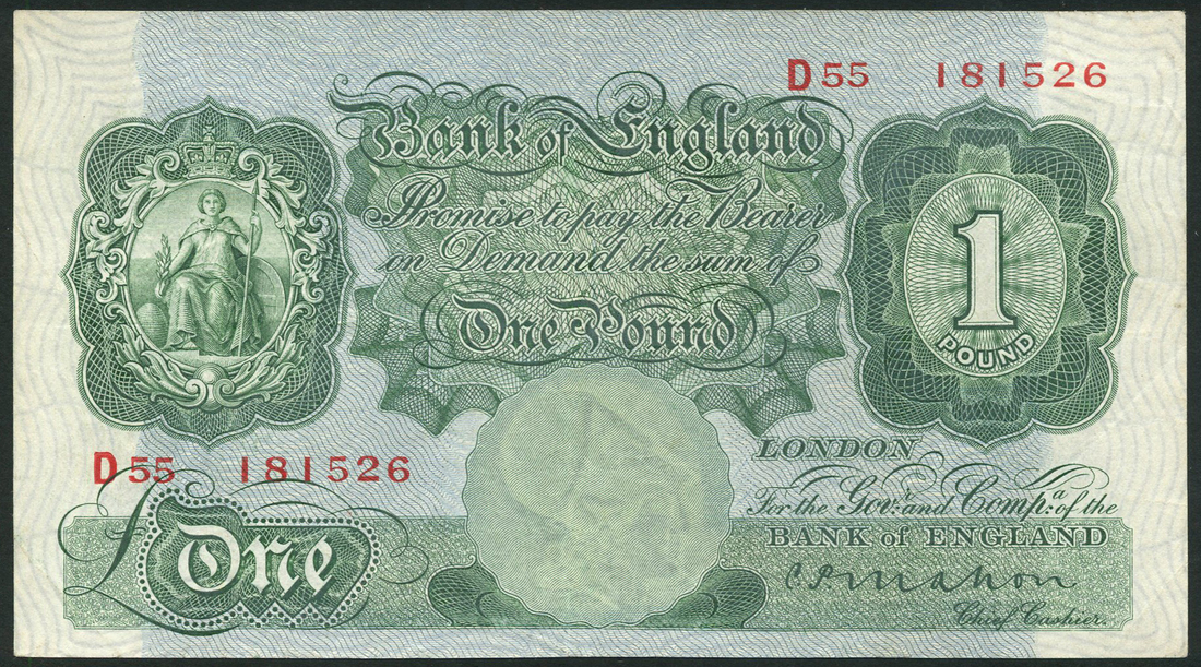 Bank of England, C P Mahon, £1 (2), ND (1928), serial number A01 647869 and D55 181526, green, Britannia at left, value at right