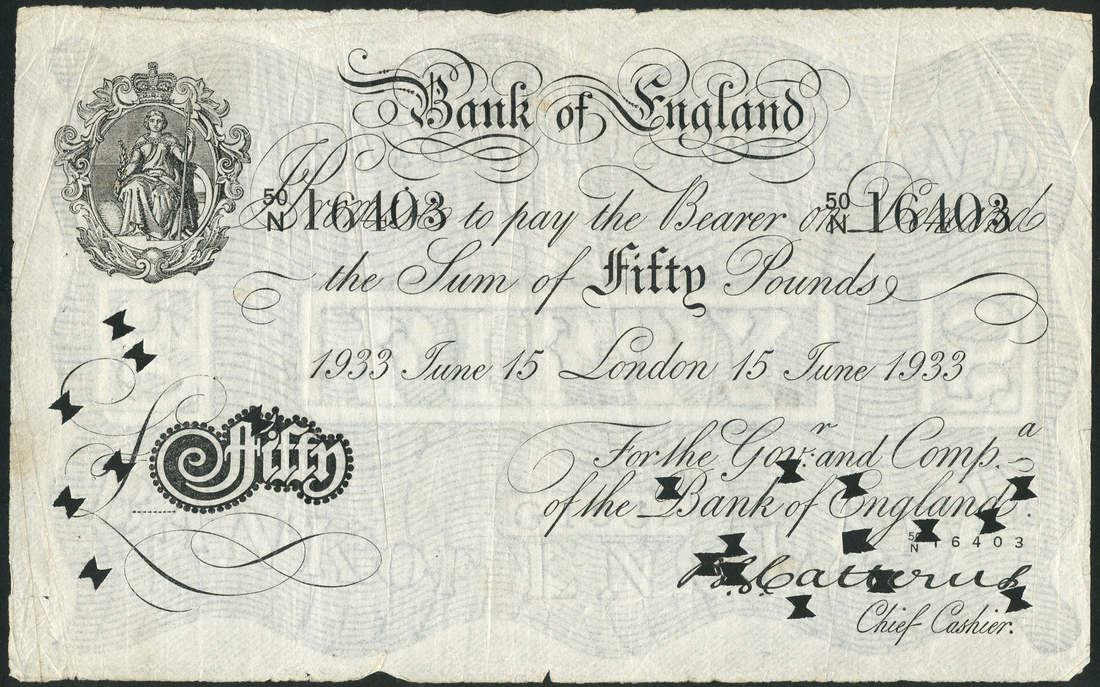 Bank of England, B G Catterns, Bernard forgery £50, 15 June 1933, serial number 50N 16403, black and white, seated Britannia in ornate circular frame top left, bank title top centre, value in black tablet low left