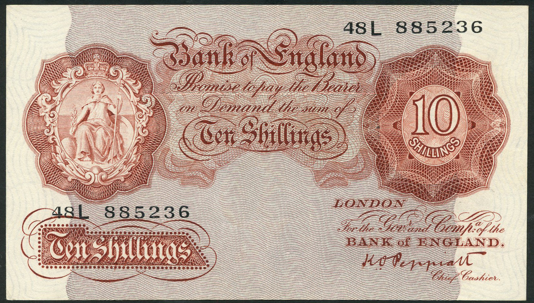 Bank of England, K O Peppiatt, 10 shillings (2), ND (1934), suffix 59X, brown, and 10 shillings, ND (1948), suffix 48L, both brown, Britannia at left, value at right