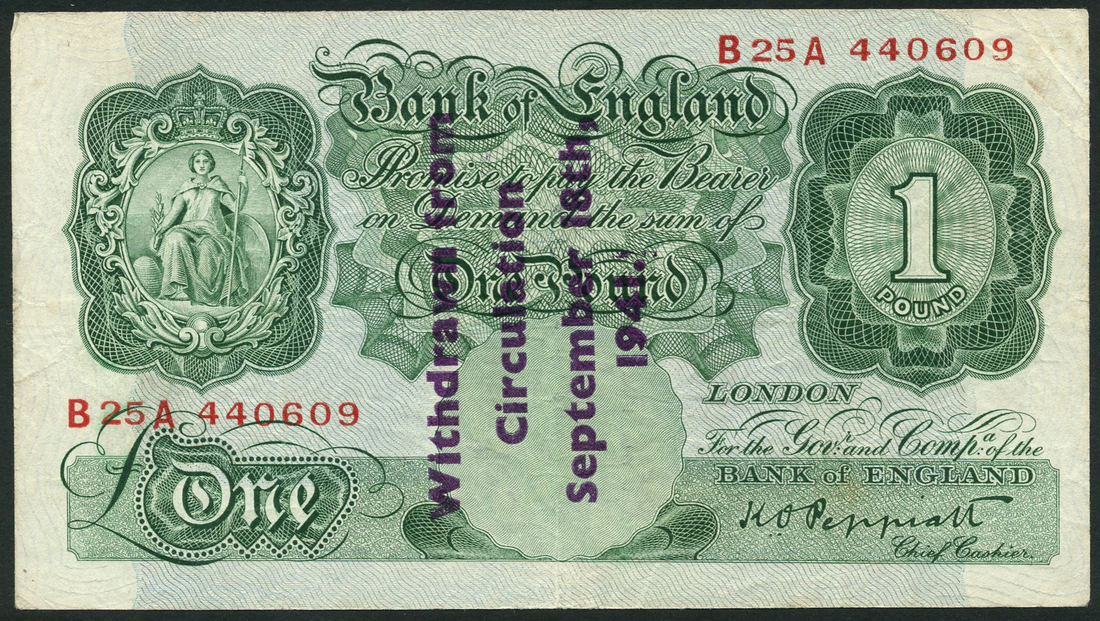 Bank of England, K O Peppiatt, Guernsey overprint £1, ND (1941), serial number B25A 440609, green and pale blue, Britannia at left, reverse green and blue, St George and dragon left and right, bank building at top, vertical stamp "Withdrawn from Circulation September 18th, 1941." at centre, together with Bank of England, P S Beale, £1, ND (1950), serial number S70S 445394,