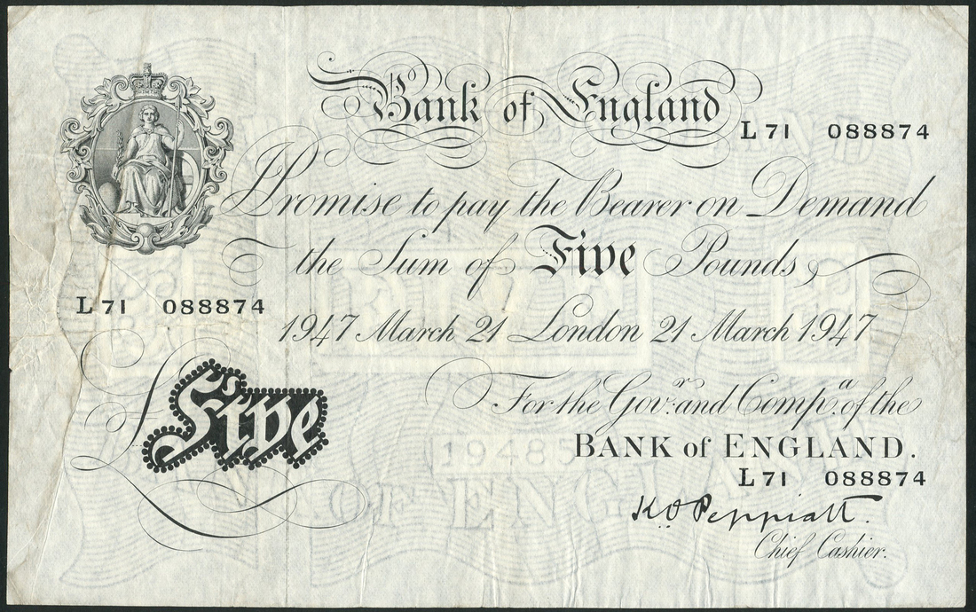 Bank of England, K O Peppiatt, 10 shillings (3), ND (1940), mauve and £1 (6), ND (1940), blue, £1 (4), ND (1934/1948), green and a £5, 1947, black and white