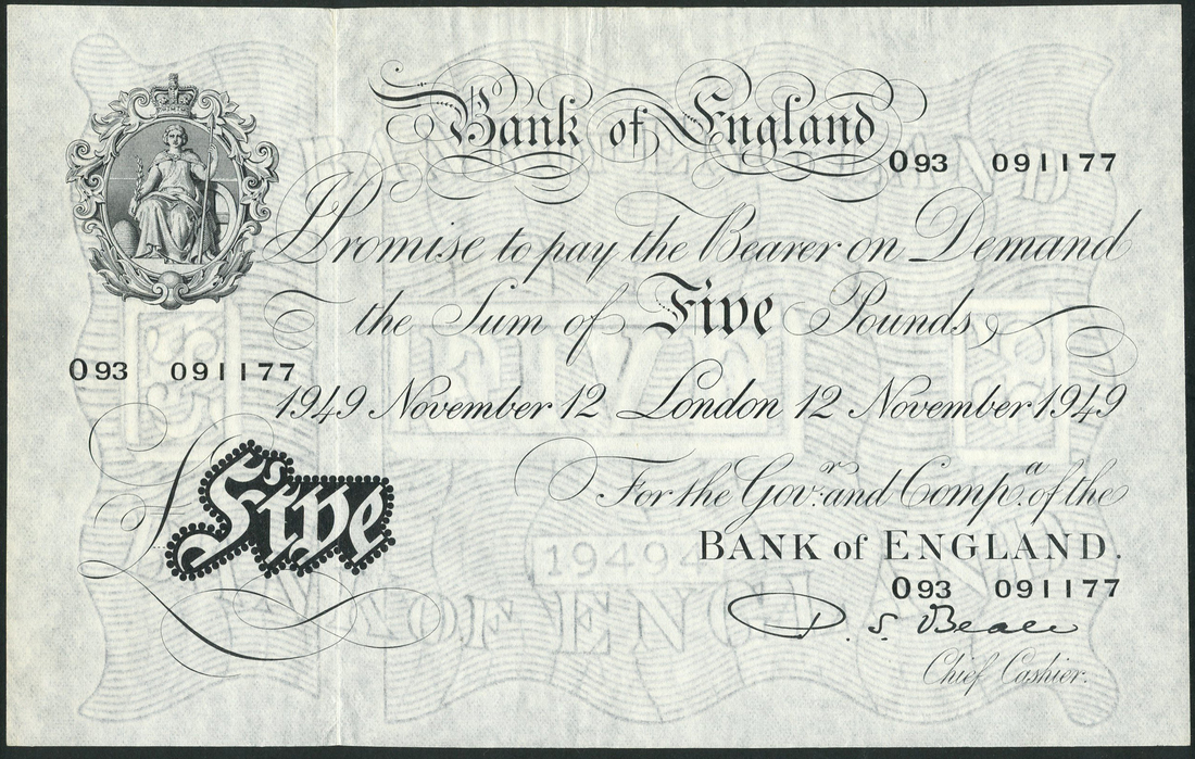 Bank of England, P S Beale, £5, 12 November 1949, serial number O93 091177, black and white, seated Britannia at top left, bank title top centre, value in black tablet low left
