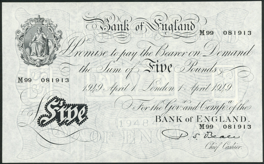 Bank of England, P S Beale, £5 (2), London, 1 April 1949 and 17 May 1950, prefixes M99 and N38, black and white, ornate crowned vignette of Britannia top left, value in black tablet low left