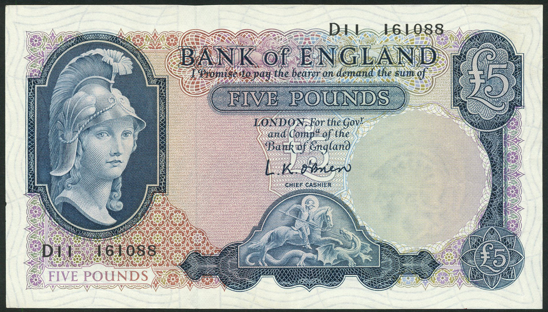 Bank of England, L K O'Brien, 10 shillings (5), ND (1955), brown, Britannia at left, value at right, £1 (5), ND (1955), green including two replacements S16T and S95S, also £5 (5), 'lion and key', prefixes A44,B60,D11,H80,J81, blue