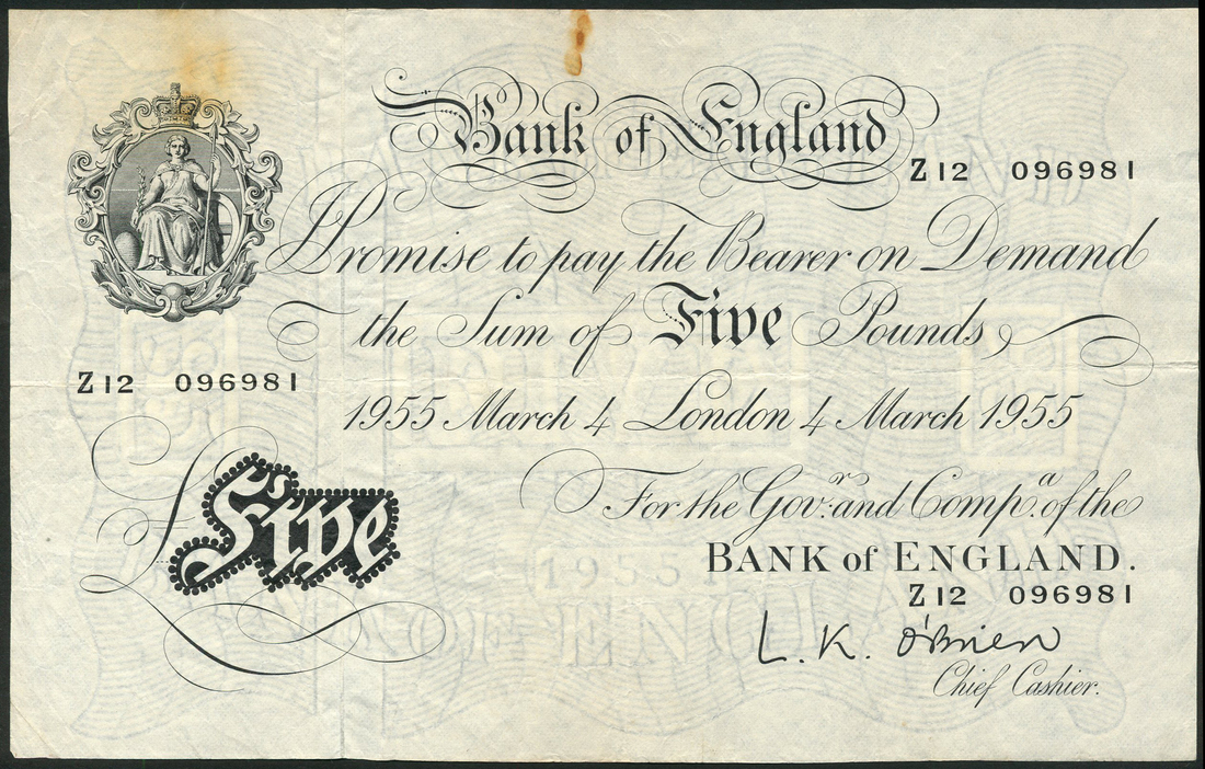 Bank of England, L K O'Brien, £5 (2), London, 4 march 1955 and 18 August 1955, prefixes Z12 and A55A, black and white, ornate crowned vignette of Britannia top left, value in black tablet low left