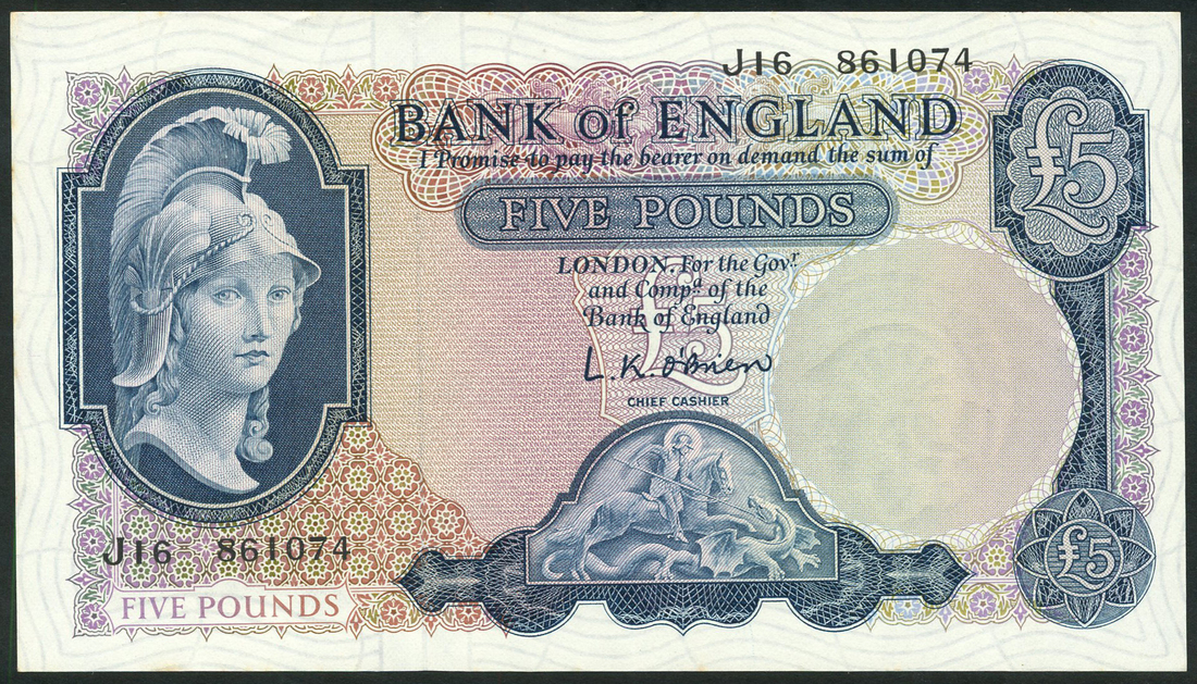 (x) Bank of England, a consecutive group £5. 1961, serial numbers blue on multicolour, Britannia at right