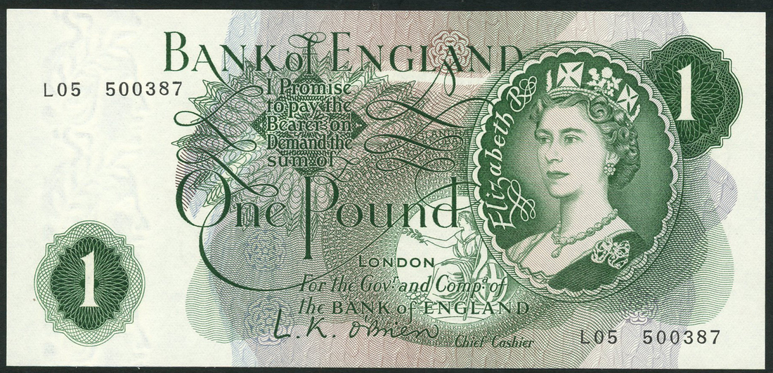 Bank of England, L K O'Brien, a group of £1, ND (1960), prefixes L05, 54L, D95, green, portrait Queen Elizabeth II at right, value low left, centre and top right, seated Britannia low centre right, reverse, value, bank title and Britannia