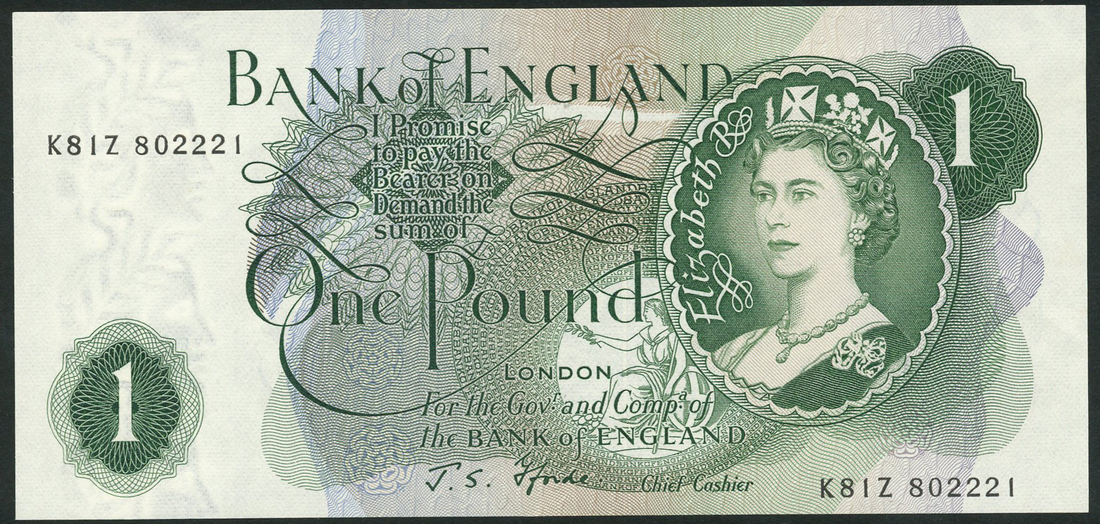 Bank of England, J S Fforde, £1, ND (1967-), prefixes A52Z (2), M47R (replacement), E77Y, K81Z, M31N (replacement), green, portrait Elizabeth II at right, Britannia low centre right