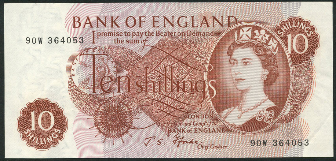 Bank of England, J S Fforde, 10 shillings (20), ND (1967), consecutive serial numbers 58W 549701/20, and, 10 shillings (16), ND (1967), consecutive serial numbers 66Z 030703/09, three groups of consecutive serial numbers, 22Y 096133/5, 45Y 535295/7 and 90W 364053/5, reddish brown, portrait Queen Elizabeth II at right, seated Britannia centre left, value in ornate circular frames low left and top right, reverse, Britannia at centre