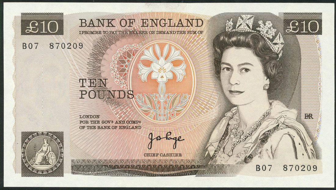 Bank of England, £10, Page, ND (1975), serial number B07 870209, £5, Bailey, ND (2004), serial number LB39 686051, £10 (2), Bailey, ND (2004), serial numbers CD01 878017 and EL50 652200, and £20, Bailey, ND (2004), serial number DE80 463677, all featuring portrait Queen Elizabeth II at right
