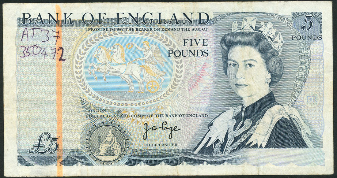 Bank of England, J B Page, £5, ND (1973), serial number (in ink) AT37 350472, blue, Elizabeth II at right, Victory in biga at left centre
