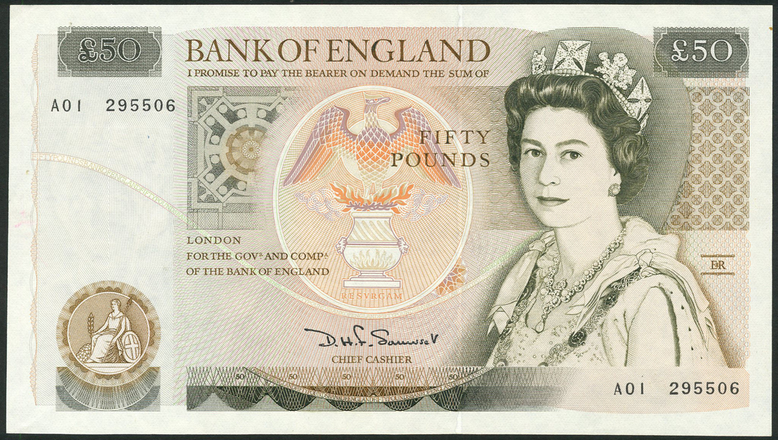 Bank of England, D H F Somerset, £50 (2), ND (1981), both prefix A01, green, Elizabeth II at right, phoenix at centre
