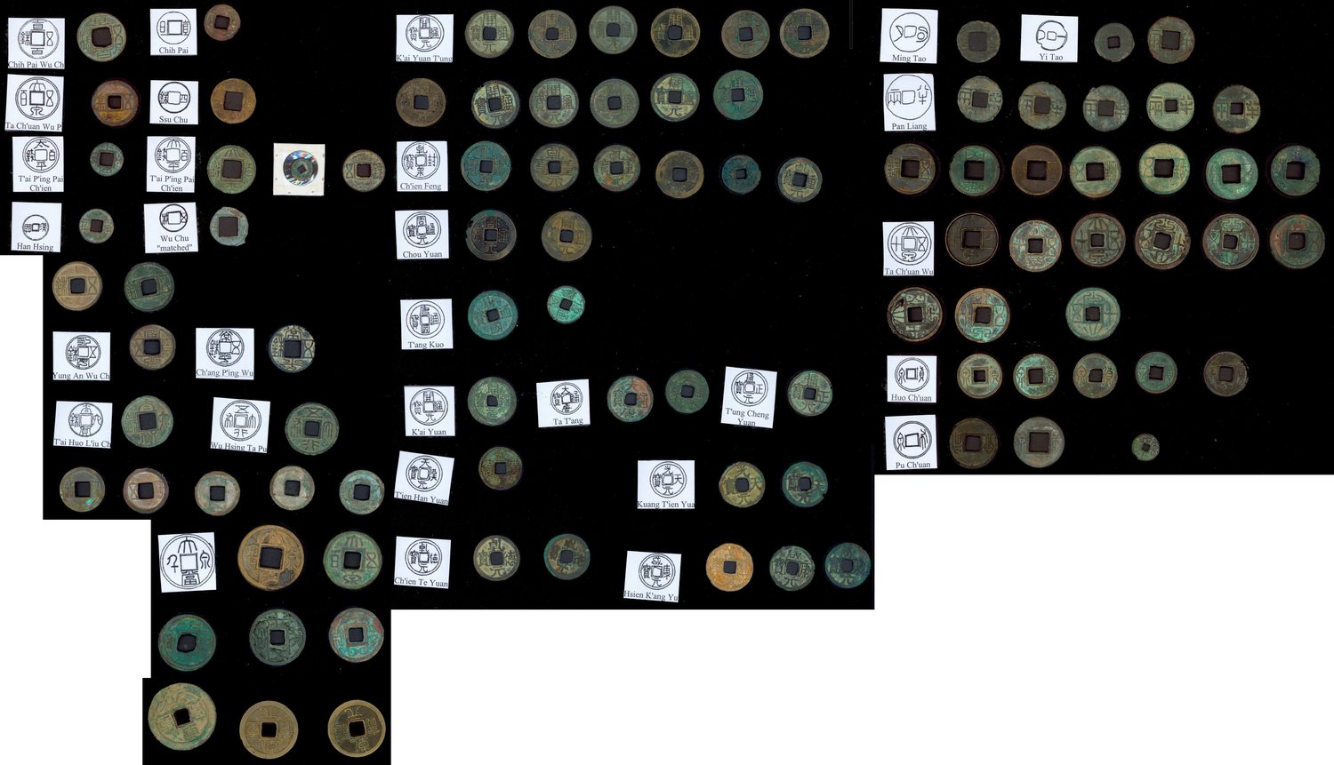 The coins include, Han/Wang Mang 'Pan liang', 'Da Quan Wu Shi', Huo Quan', 'Bu Quan', 'Zhi Bai Wu Zhu', 'Zhi Bai', 'Da Quan Wu Bai', Tai PIng Bai Qian', 'Han Xing', 'Si Zhu', 'Wu Zhu', 'Yong An Wu Zhu', 'Chang Ping Wu Zhu', 'Tai Huo Liu Zhu', 'Kai Yuan Tong Bao', Qian Feng Quan Bao', 'Han Yuan Tong Bao', 'Zhou Yuan Tong Bao', Tang Guo Tong Bao', Da Tang Tong Bao', 'Tong Zheng Yuan Bao', Tian Han Yuan Bao', 'Guang Tian Yuan Bao', 'Qian De Yuan Bao', Xian Kang Yuan Bao'Qian Heng Zhong Bao,