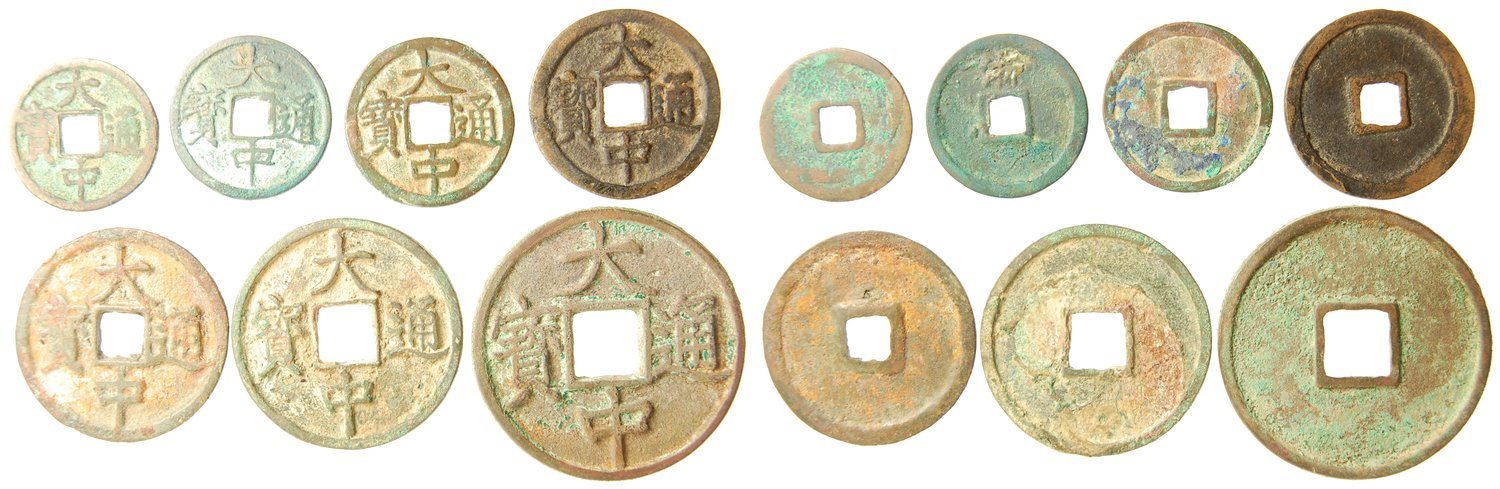 Yuan rebel coinage, Da Zhong Tong Bao, lot of 7 copper cash coins, struck by Zhu Yuanzhang when he was the King of Wu (1361 to 1367), and also during 1371, coins bearing this era is synonymous with the uprising of Han Chinese against the Mongol ruled Yuan Dynasty,