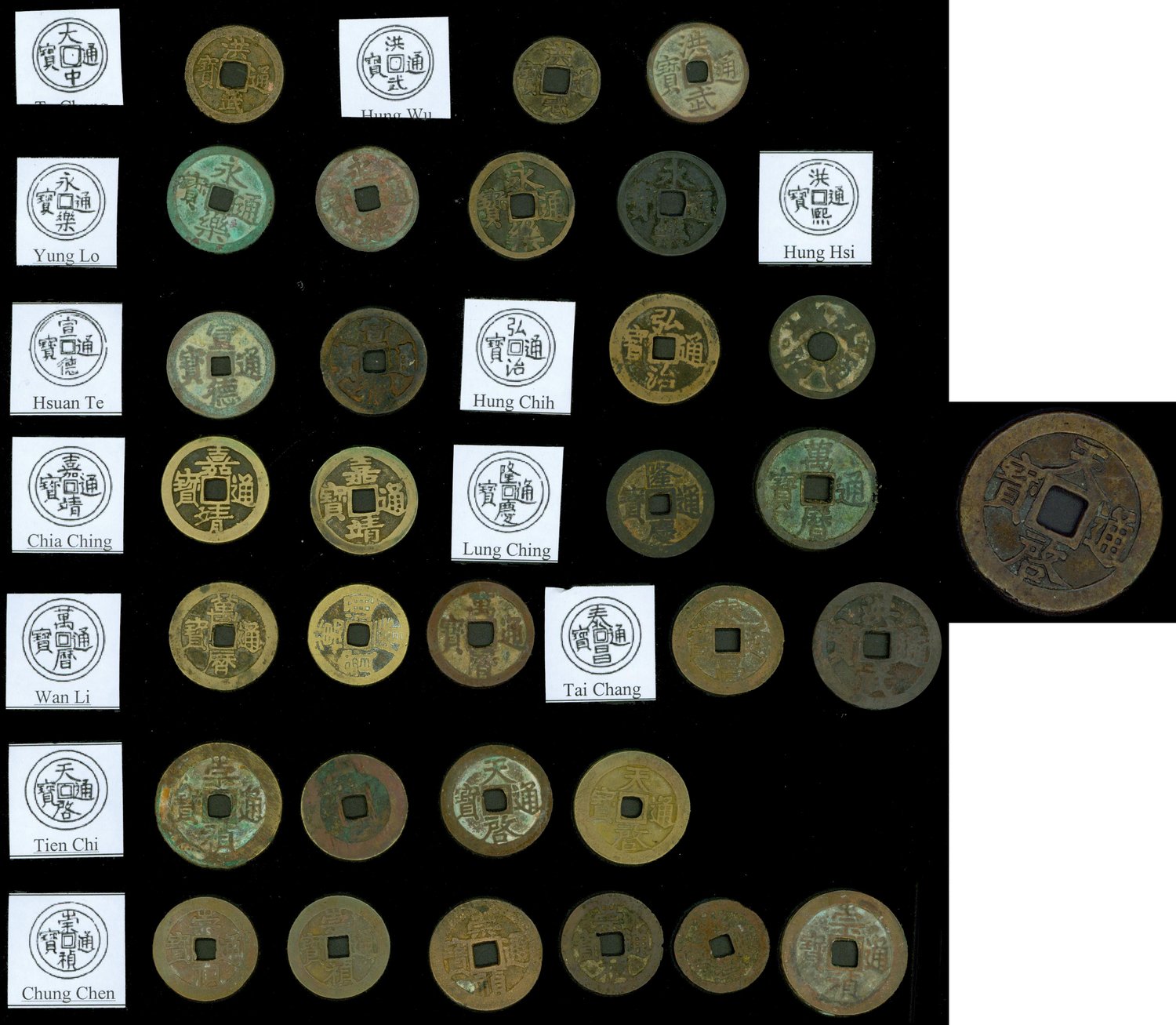 well in good states of preservation, different sizes and denominations seen. The Tai Chang Tong Bao is a scarce coin as the emperor only reienged for 3 months (31)