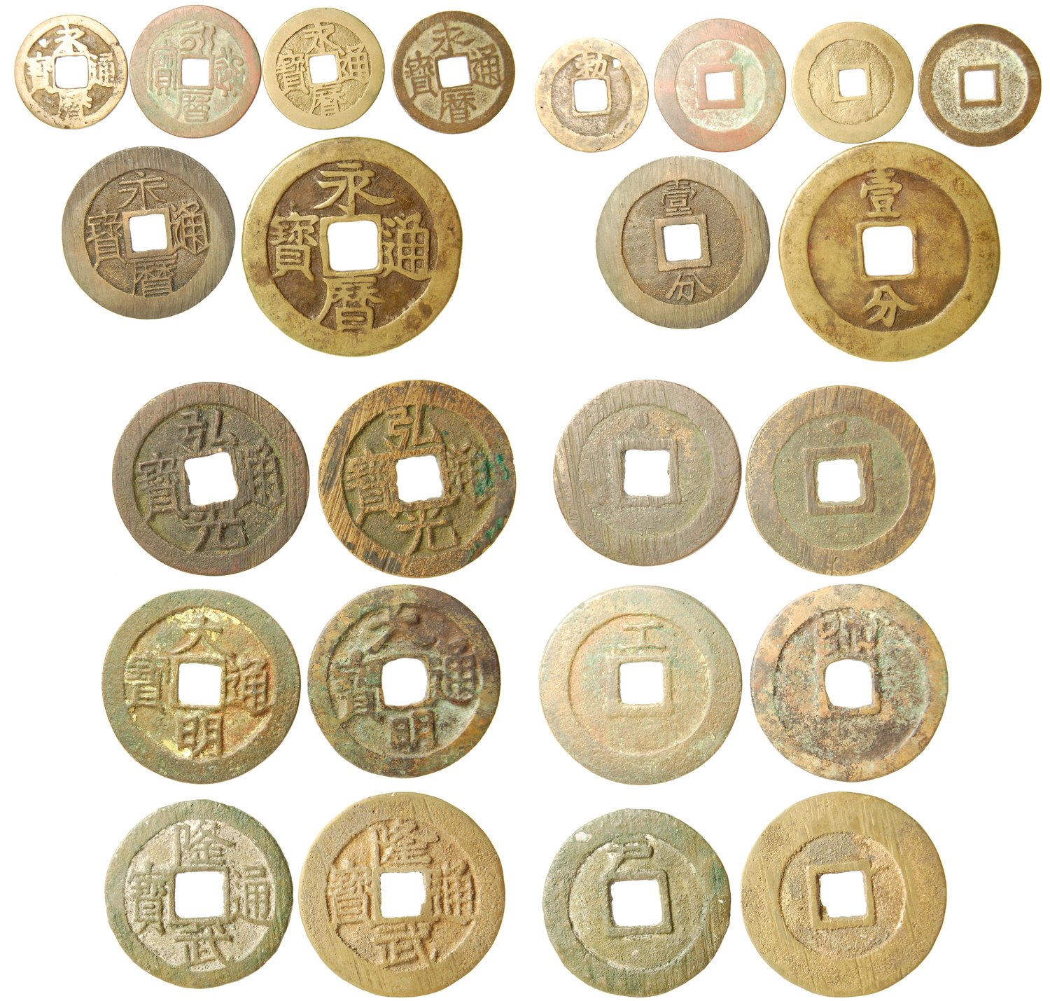 Hongguang Tong Bao (2), Longwu Tong Bao (2), Da Ming Tong Bao, issued by Prince of Lu (2) and Yongli Tong Bao (x4 small cash and x2 large sized 1 fen, 37mm and 45mm respectively)
