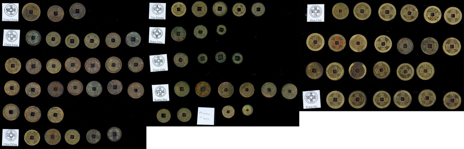 Qing Dynasty, a collection of c.75 copper cash coins, complete from Shunzhi to Xuantong (no Qixiang era date coins), many different mint marks on reverse,