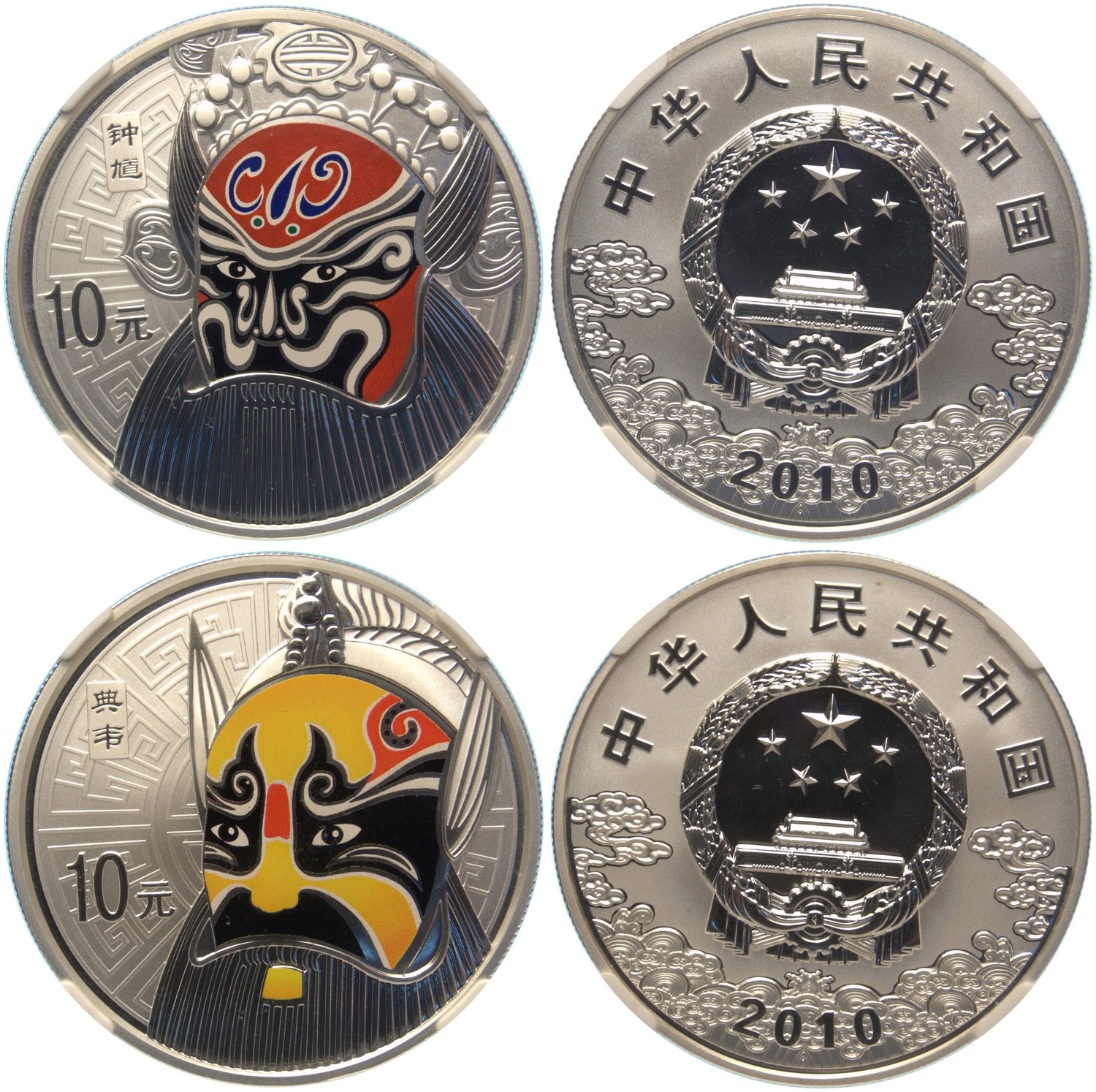 People's Republic of China, pair of silver 10 yuan, 2010, 'Peking Opera Face Paintings', Colourised Series 1 featuring Zhong Kui and Dian Wei,