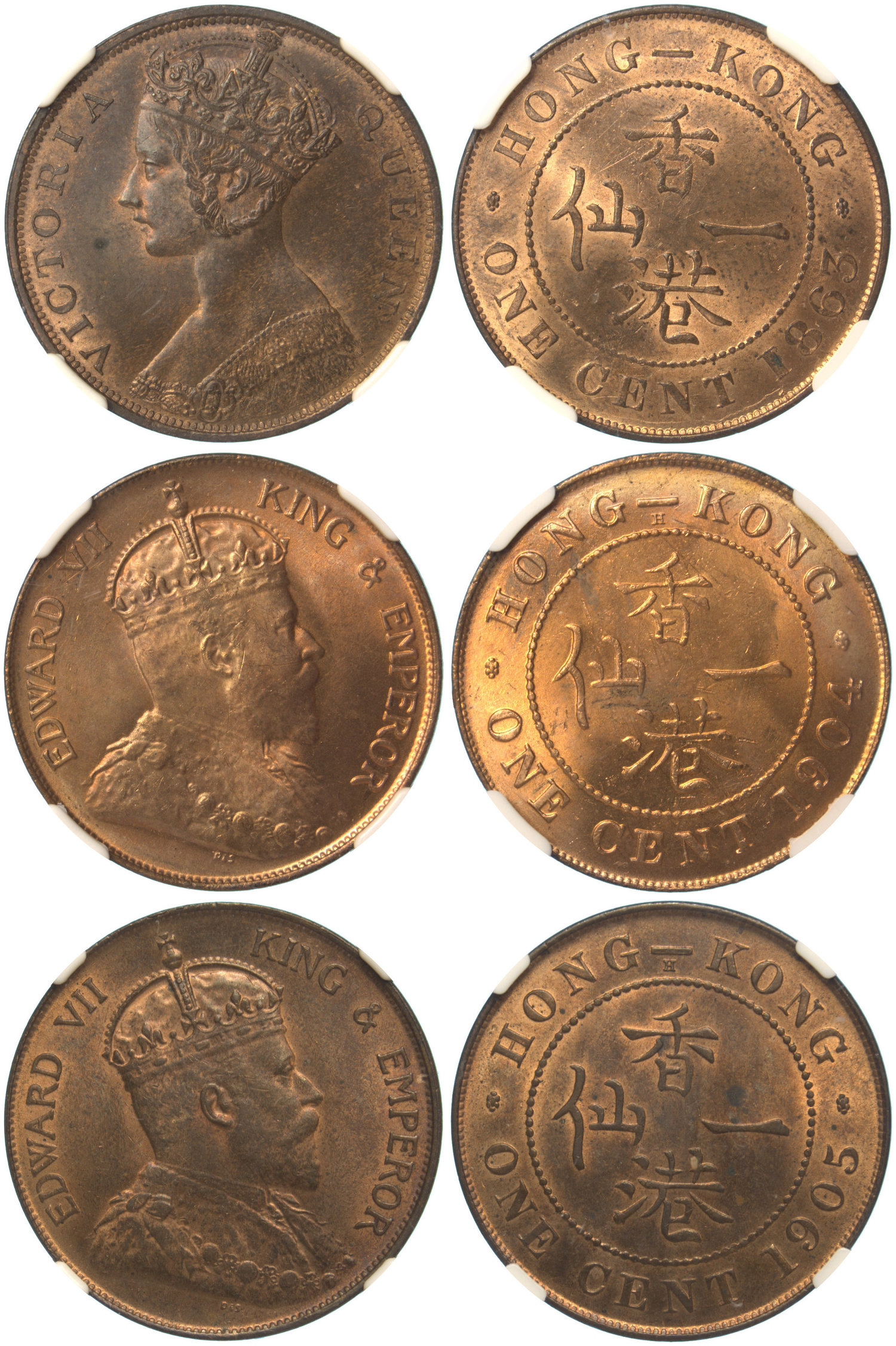 Hong Kong, group of 3x bronze 1 cent coins, 1863, 1904-H and 1905-H,