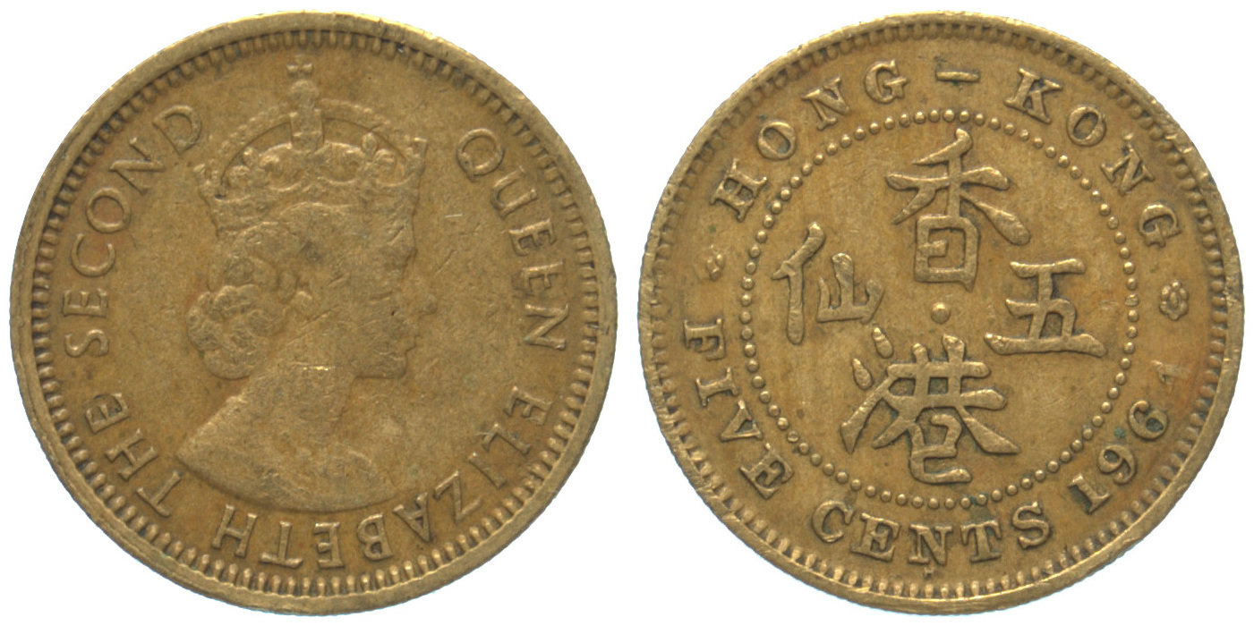 Hong Kong, brass 5 cents, 1964-H, key date of the series,