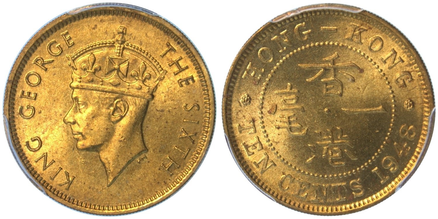 Hong Kong, brass 10 cents, 1948, Geroge VI,