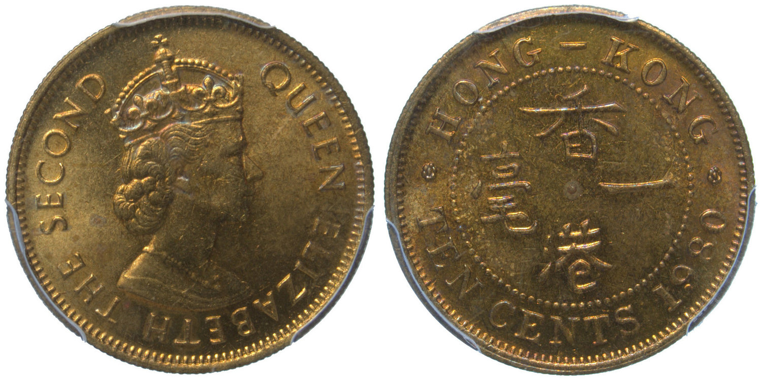 Hong Kong, brass 10 cents, 1980, PCGS MS 63