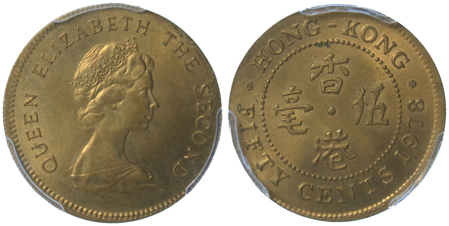 Hong Kong,50C, 1978, ‘Mint Error’,struck on 10C brass nickel planchet,