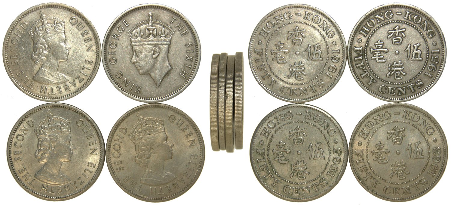 Hong Kong, lot of 4x cupro nickel 50 cents, ERROR mill edge coins, 1951, 1961, 1963 and 1965,