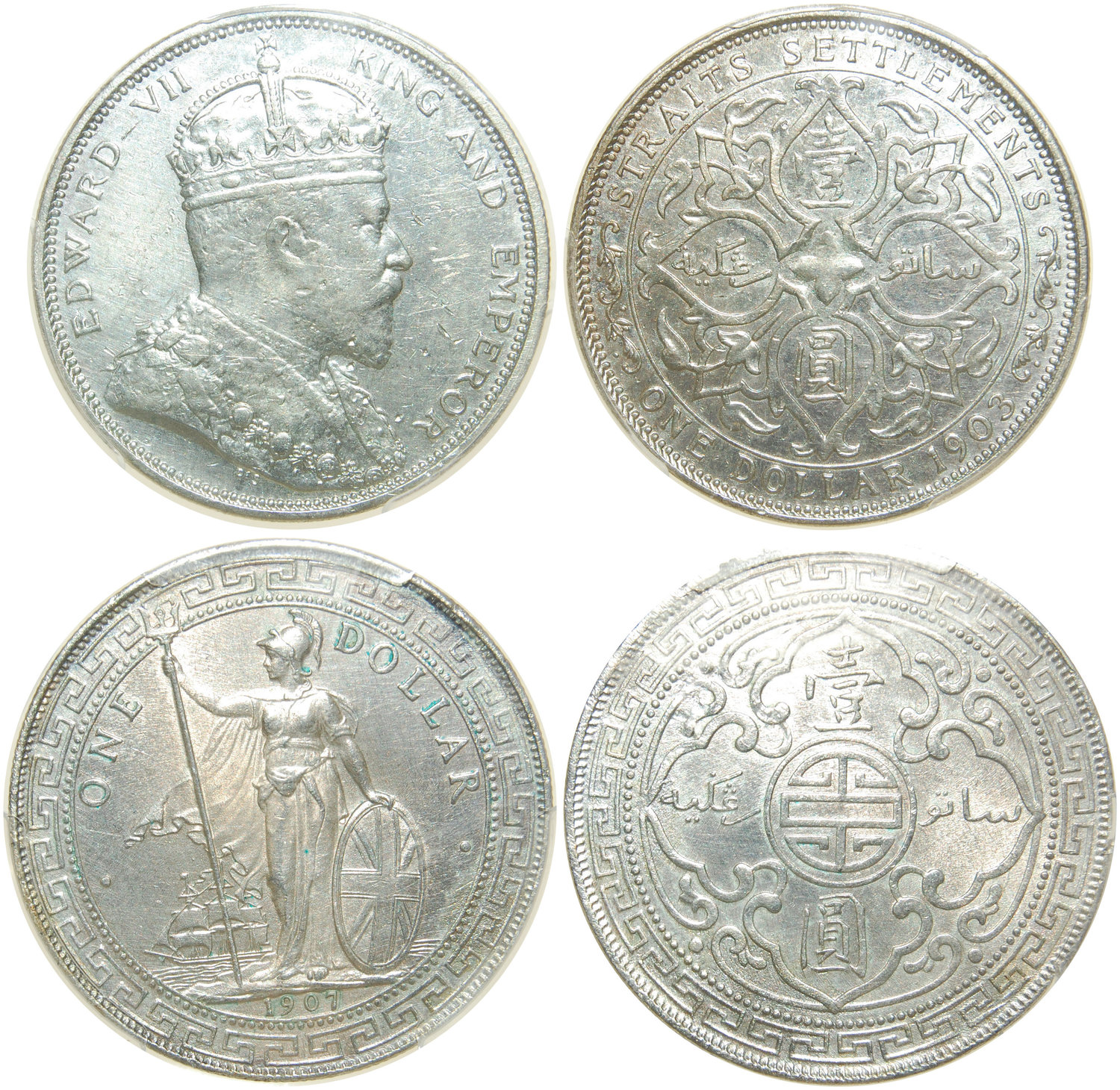 Straits Settlements, silver $1, 1903-B, also Great Britain, 1907-B,